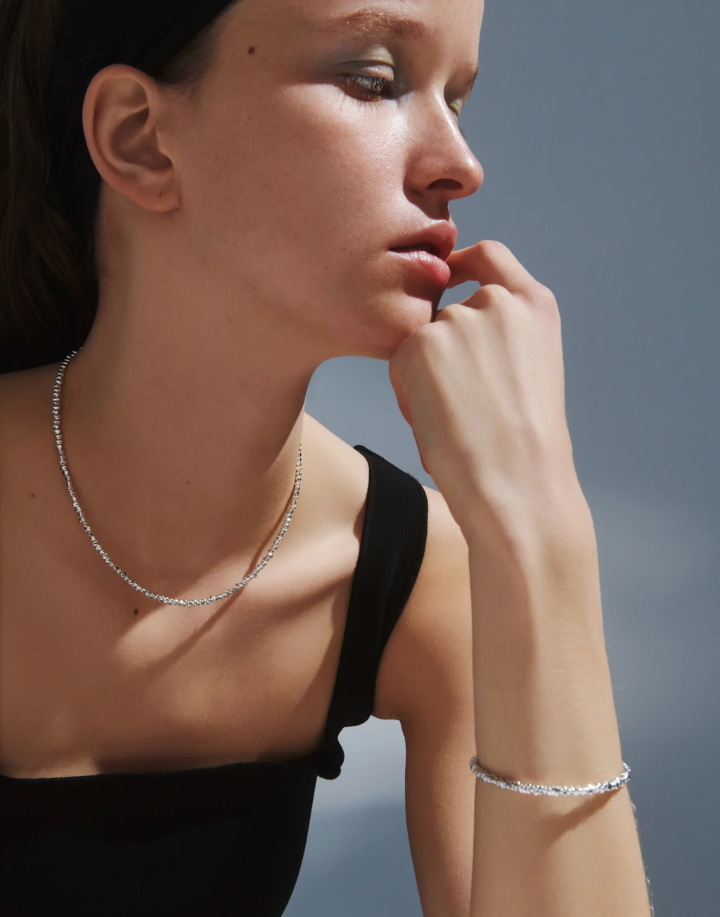 搭配黑色 T 恤或背心上衣呈現輕盈、清爽的印象;若直接配合素肌佩戴銀色的通透感更顯突出,為手部增添優雅光彩